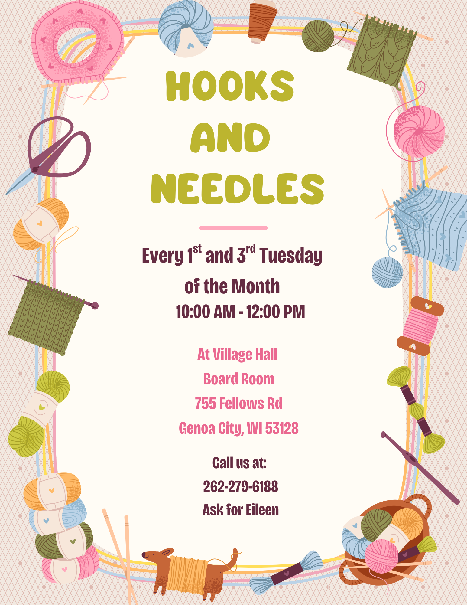 Hooks and Needles is an informal meeting for patrons who have interest in knitting, crocheting, cross stitch, quilting, sewing, or embroidery.